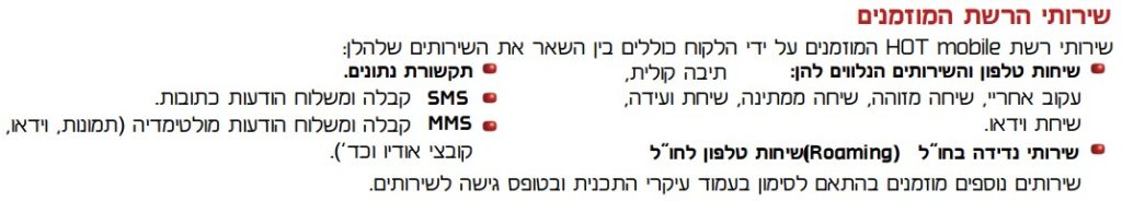 ב-mobile HOT. שרותים נוספים אשר המנוי יצרוך ואינם כלולים בתכנית זו, יחויבו בנפרד בחשבונית החיוב ו/או ייגבו ישירות על-ידי